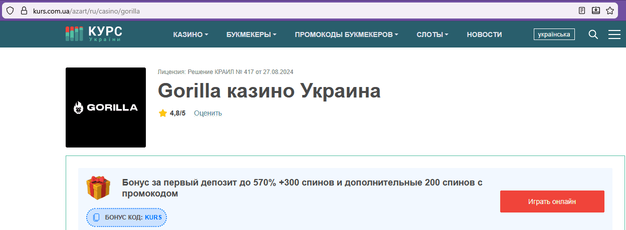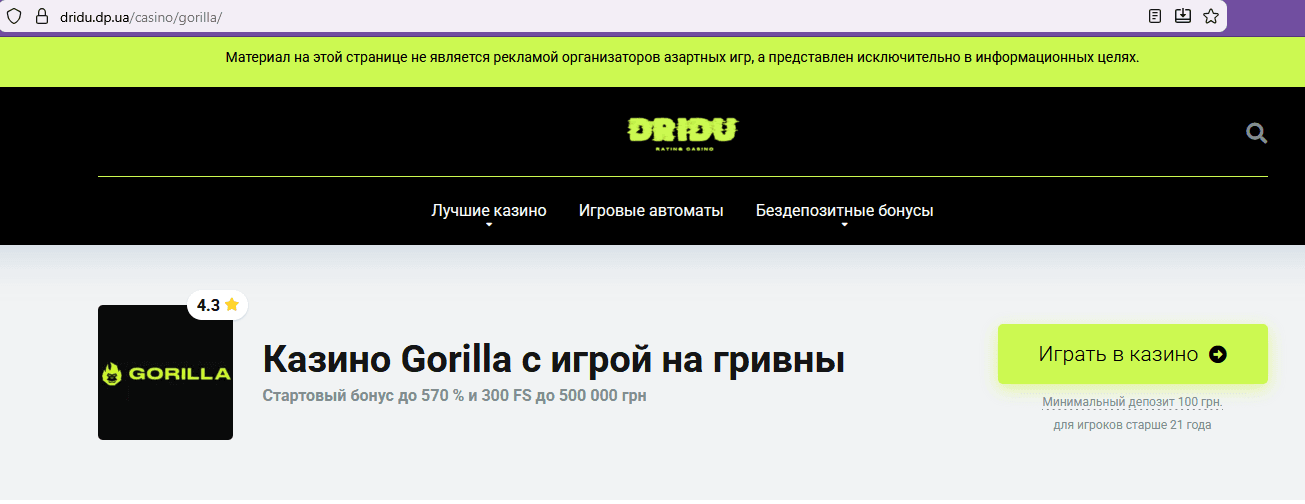 на тому ж домені з’являється сайт із рекламою казино Gorilla.