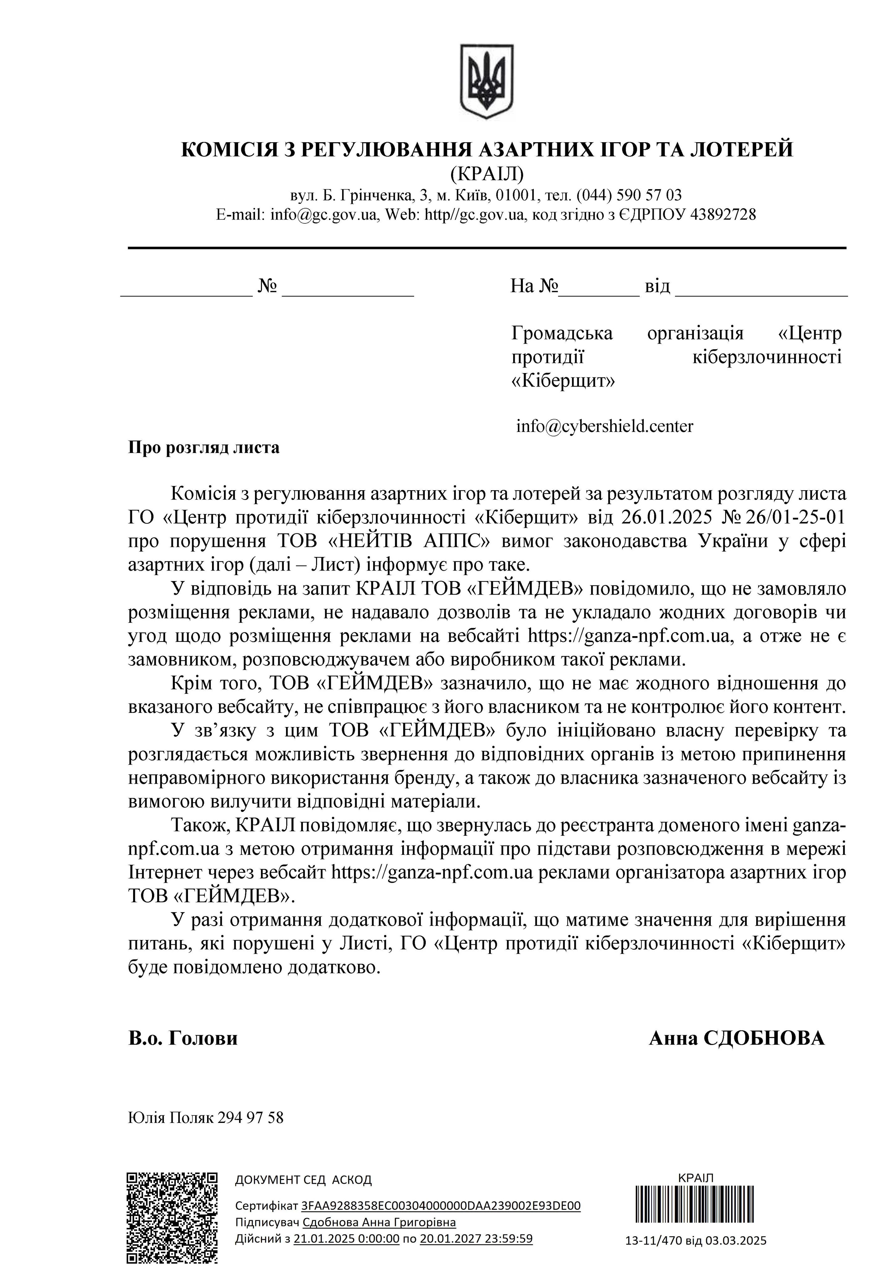 На початку цього року ГО «Центр протидії кіберзлочинності “Кіберщит” звертається до регулятора КРАІЛ. І отримує відписку: оператор бренду Слотс Сіті ТОВ “ГЕЙМДЕВ” каже, що він нічого не замовляв і “не має відношення” та проводить розслідування як так могло статися. Ця відповідь була отримана в лютому 2025 року та до цього часу недобросовісна реклама казино Слотс Сити продовжує демонструватися.