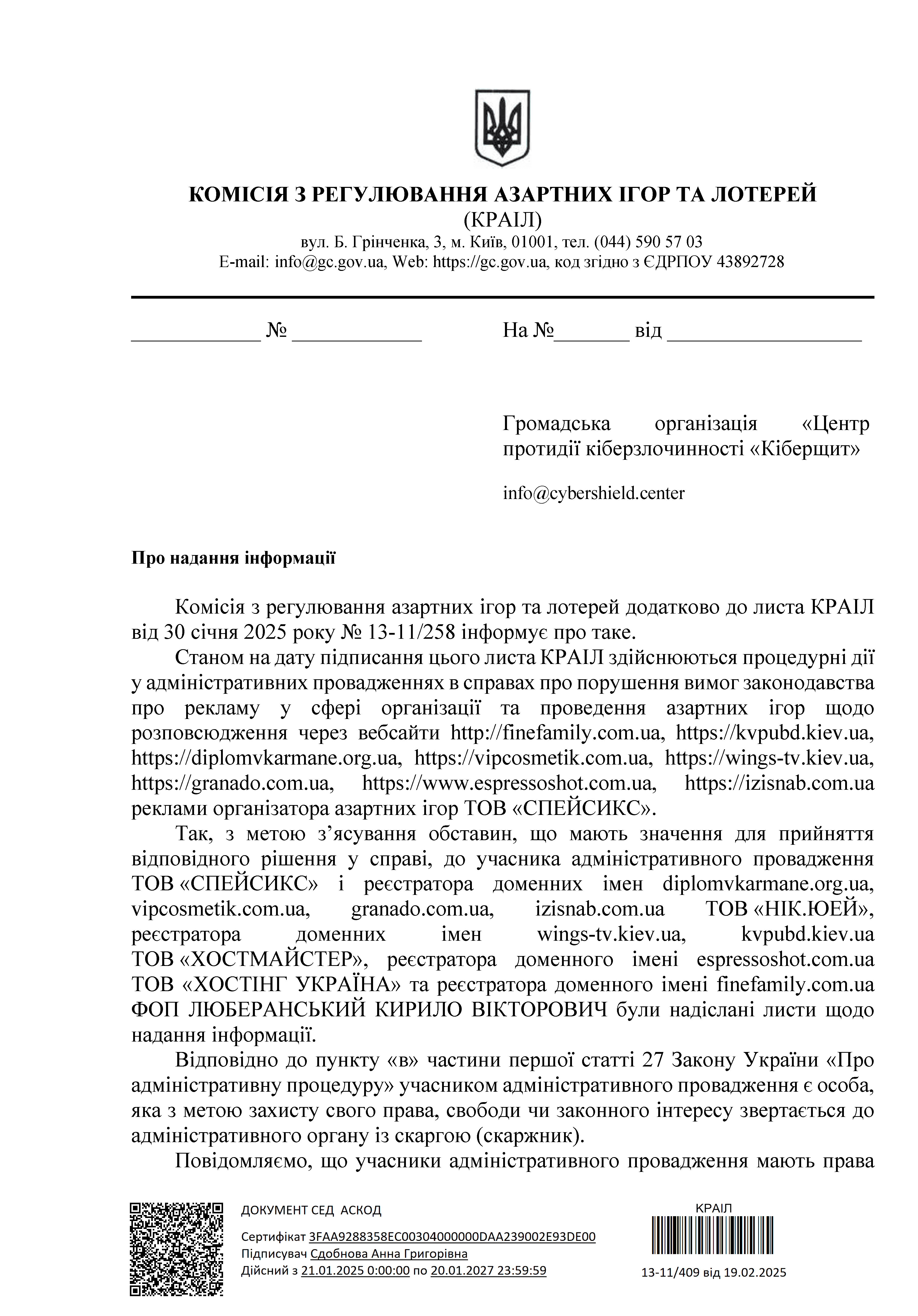 За результатами звернення нашої організації, Комісія з регулювання азартних ігор та лотерей (КРАІЛ) надала додаткову офіційну інформацію щодо стану адміністративних проваджень проти організатора азартних ігор ТОВ «СПЕЙСІКС», реклама якого незаконно розповсюджувалася на низці сайтів.